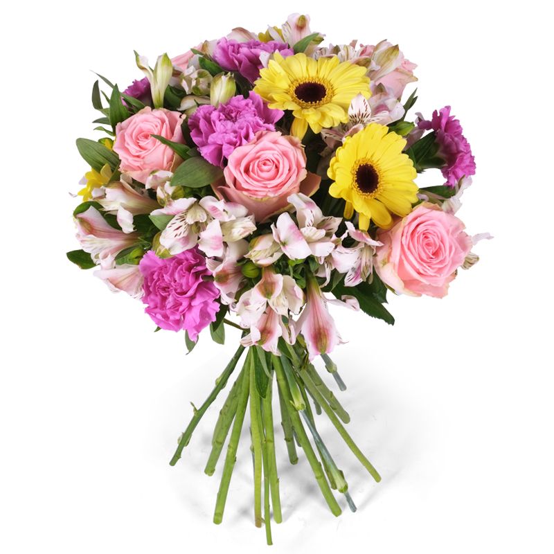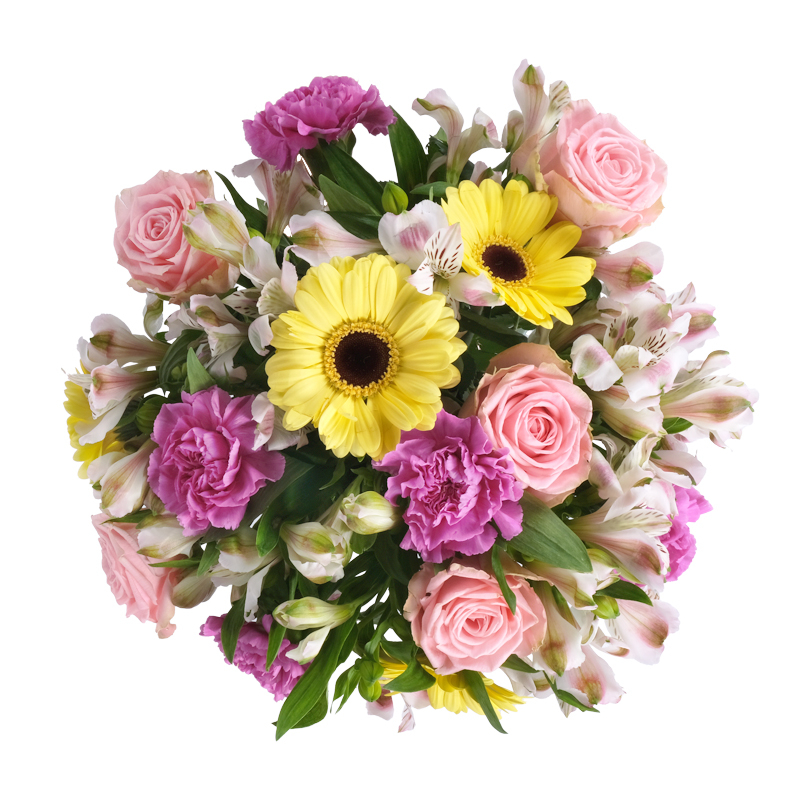 Kompozycja łącząca romantyzm róż, optymizm gerber, ciepło goździków i delikatność alstromerii. Bukiet emanujący harmonią i spokojem. Świeże liście tworzą naturalne tło. Bukiet dla każdego, kto ceni sobie delikatne, aczkolwiek piękne formy.
