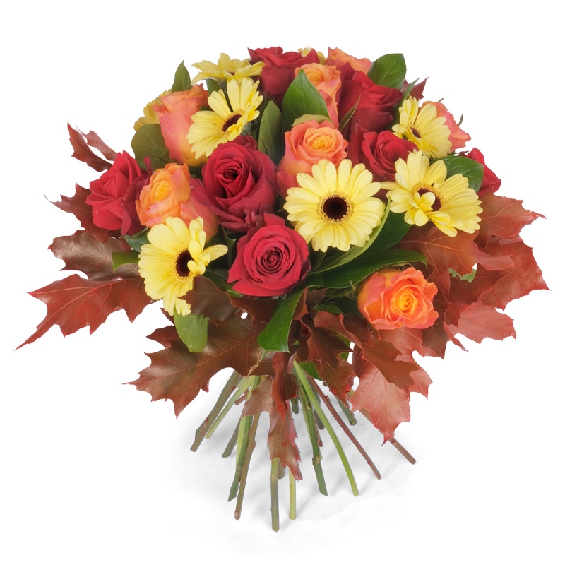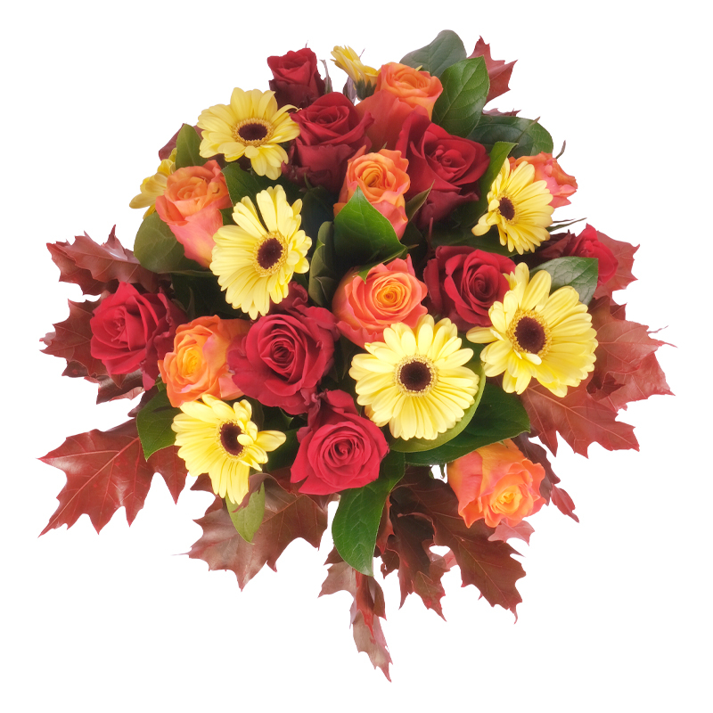 Połączenie kwiatów i liści w doskonałej równowadze. „Obfita Jesień” zachwyca swoją elegancją. Róże i gerbery pięknie prezentują się w otoczeniu liści klonu. To bukiet, który dodaje wnętrzu charakteru. Idealny na prezent od serca dla osoby, kochającej najbardziej kolorową porę roku!